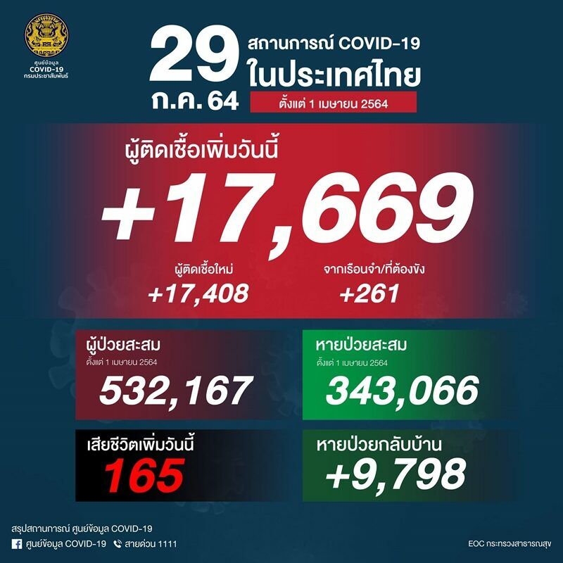 โควิดวันนี้ 29 ก.ค. 64 ผู้ติดเชื้อวันนี้ – ศูนย์ปฏิบัติการฉุกเฉิน กรมควบคุมโรค ได้เผยแพร่ตัวเลขสถานการณ์ผู้ติดเชื้อโควิด ประจำวันที่ 29 กรกฎาคม ว่ามีผู้ป่วยจำนวน 17,669 ราย โดยในจำนวนดังกล่าวเป็นผู้ติดเชื้อจากเรือนจำ 165 ราย ขณะที่มีผู้ป่วยกลับบ้านเพิ่ม 9,798 ราย และมียอดผู้ป่วยสะสมตั้งแต่ช่วงเมษายน อยู่ที่ 532,167 ราย