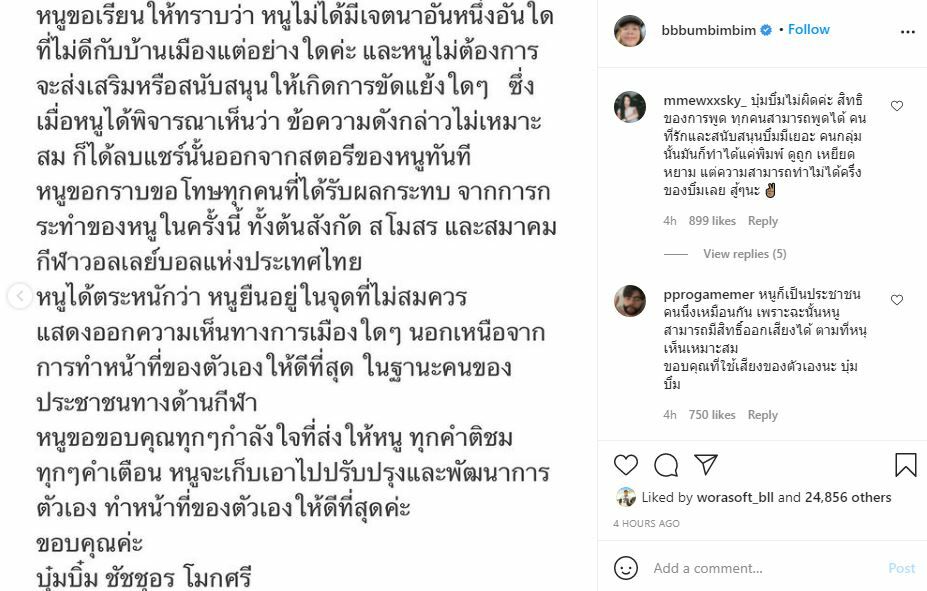 “หนูขอกราบขอโทษทุกคนที่ได้รับผลกระทบจากการกระทำของหนูครั้งนี้ ทั้งต้นสังกัด สโมสร และสมาคมกีฬา วอลเลย์บอล แห่งประเทศไทย หนูได้ตระหนักว่าหนูยืนอยู่ในจุดที่ไม่สมควรแสดงออกความเห็นทางการเมืองใดๆ นอกเหนือจากการทำหน้าที่ของตัวเองให้ดีที่สุด ในฐานะคนของประชาชนด้านกีฬา”