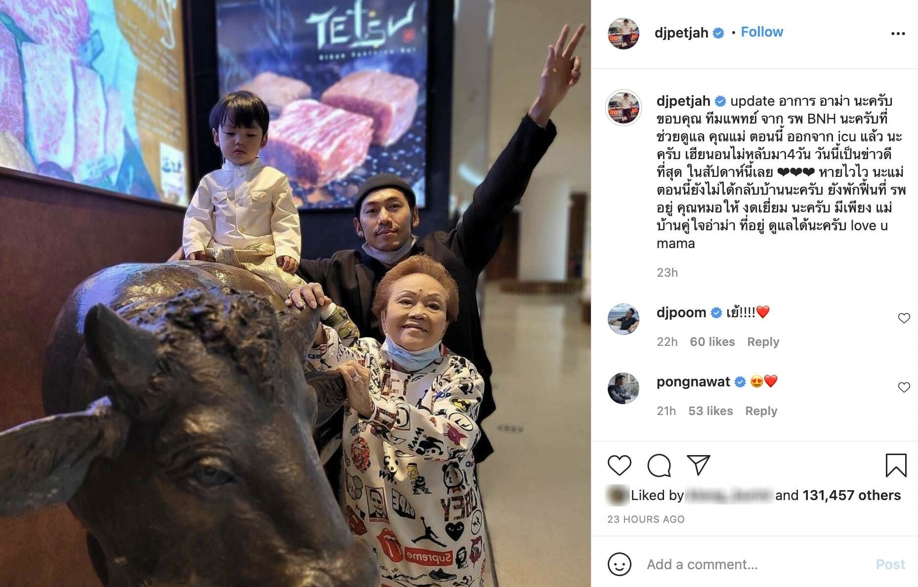 โดยหนุ่มเพชรจ้า ได้โพสต์อัพเดตอาการของคุณแม่ผ่านอินสตาแกรม @djpetjah ระบุว่า