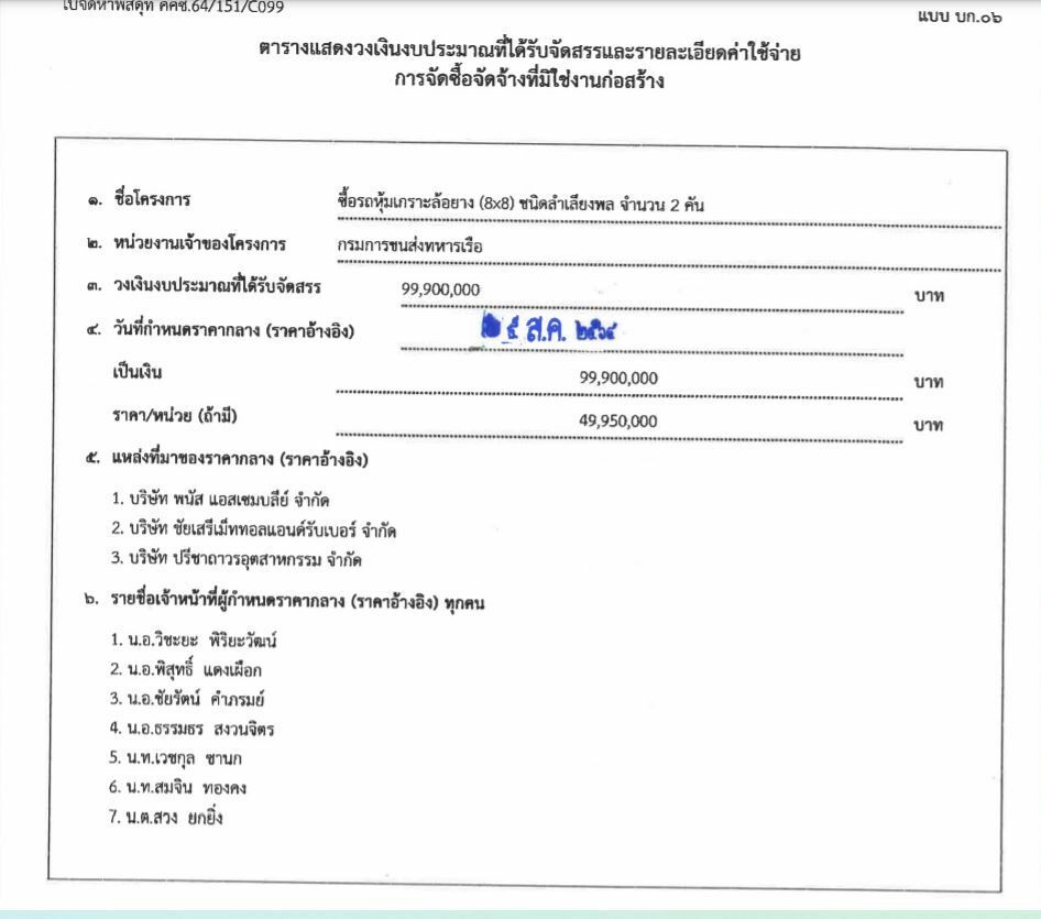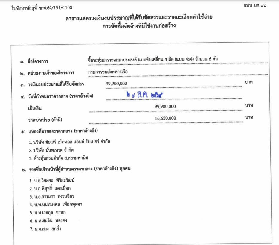 ต่อมา วันที่ 27 ส.ค. กรมการขนส่งทหารเรือ ได้ออกประกาศการจัดซื้อจัดจ้างในโครงการซื้อรถหุ้มเกราะอเนกประสงค์แบบขับเคลื่อน 4 ล้อ (4x 4) จำนวน 6 คัน วงเงินงบประมาณ 99,900,000 บาท คันละ 16,650,000 บาท