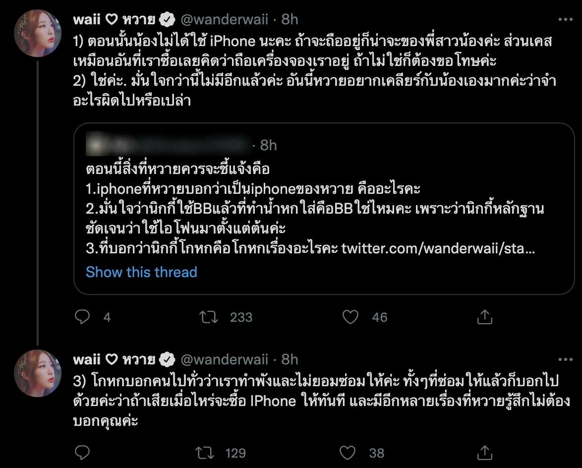3) โกหกบอกคนไปทั่วว่าเราทำพังและไม่ยอมซ่อมให้ค่ะ ทั้งๆที่ซ่อมให้แล้วก็บอกไปด้วยค่ะว่าถ้าเสียเมื่อไหร่จะซื้อ IPhone ให้ทันที และมีอีกหลายเรื่องที่หวายรู้สึกไม่ต้องบอกคุณค่ะ”