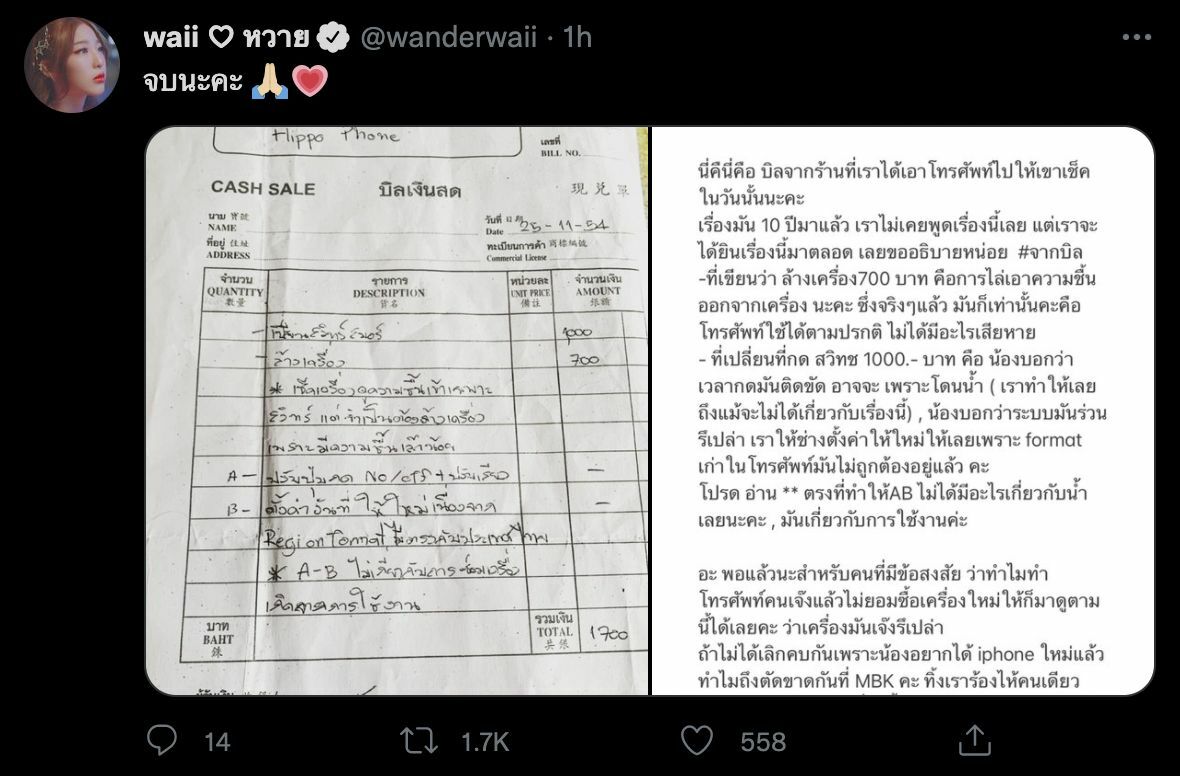 หวาย ซัดกลับ นิกกี้ โกหก พร้อมโชว์บิลแนบหลักฐาน ปมซ่อมโทรศัพท์