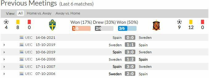 สวีเดน ฟอร์มช่วงหลังยังค่อนข้างดี ไร้พ่ายจากการลงสนาม 9 นัดที่ผ่านมา เกมในบ้านยังทำได้ค่อนข้างดี ด้านทีมเยือนสเปน เสมอชนะ 1 นัดเดียวเท่านั้นจากการลงสนาม 6 นัด ทำให้เสมอรวมมากถึง 5 จาก 6 นัดหลัง แต่ไร้พ่ายยาวนาน 14 นัดที่ผ่านมา อย่างไรก็ตามเกมนี้คาดว่าทัพกระทิงดุยังมีดีพอที่จะบุกมาแบ่งแต้มได้ในเกมนี้