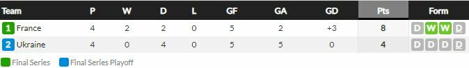 ยูเครน แม้จะเล่นในบ้านเกมนี้ แต่ฝรั่งเศสยังดูมีคุณภาพนักเตะที่ดีกว่า และต้องการจะทำแต้มหนีห่างออกไป จึงเชื่อว่าทัพตราไก่จะมีสิทธิ์บุกมาเก็บ 3 แต้มได้ในเกมนี้