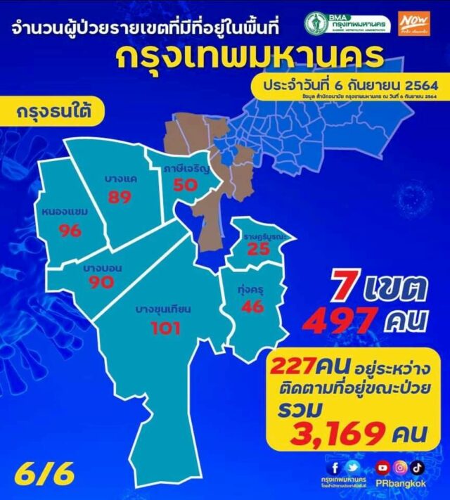 กทม. เผย จำนวนผู้ป่วยโควิด-19 ประจำวัน (6/9/2564) : โดยรวม 3,169 ราย