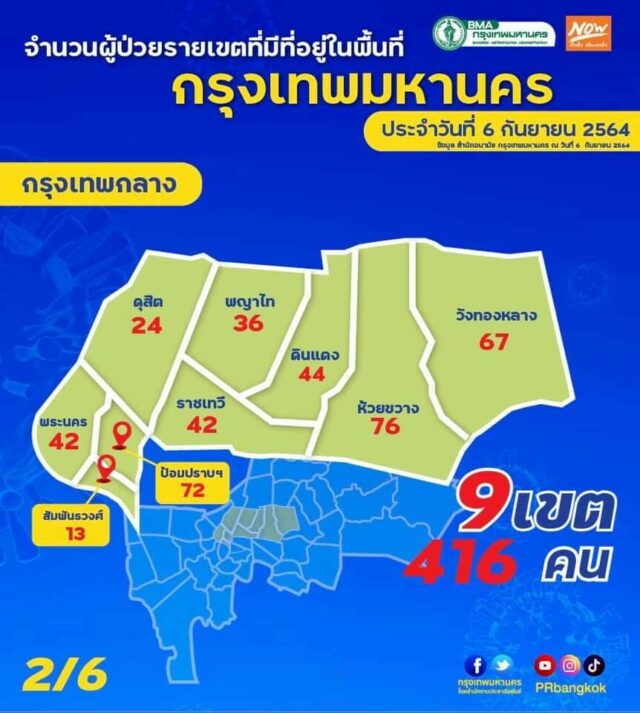 วันนี้ (6/9/2564) – กทม. ทำการประกาศเปิดเผย จำนวนผู้ป่วยโควิด-19 ประจำวัน ในพื้นที่กรุงเทพมหานคร โดยจำนวนล่าสุดอยู่ที่ 3,169 ราย จากทั้งหมด 50 เขต