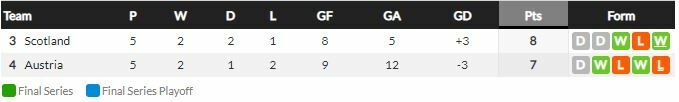 ออสเตรีย ฟอร์มตามมาตรฐาน ชนะได้ 3 เกมจาก 6 นัดที่ผ่านมา ด้าน สกอตแลนด์ ฟอร์มช่วงหลังยังไม่ดีนักชนะนัดเดียวจากการเล่น 5 นัดที่ผ่านมาในเกมล่าสุด เกมนี้ค่อนข้างสูสี และสุดท้ายแล้วน่าจะแบ่งกันไปทีมละ 1 แต้ม
