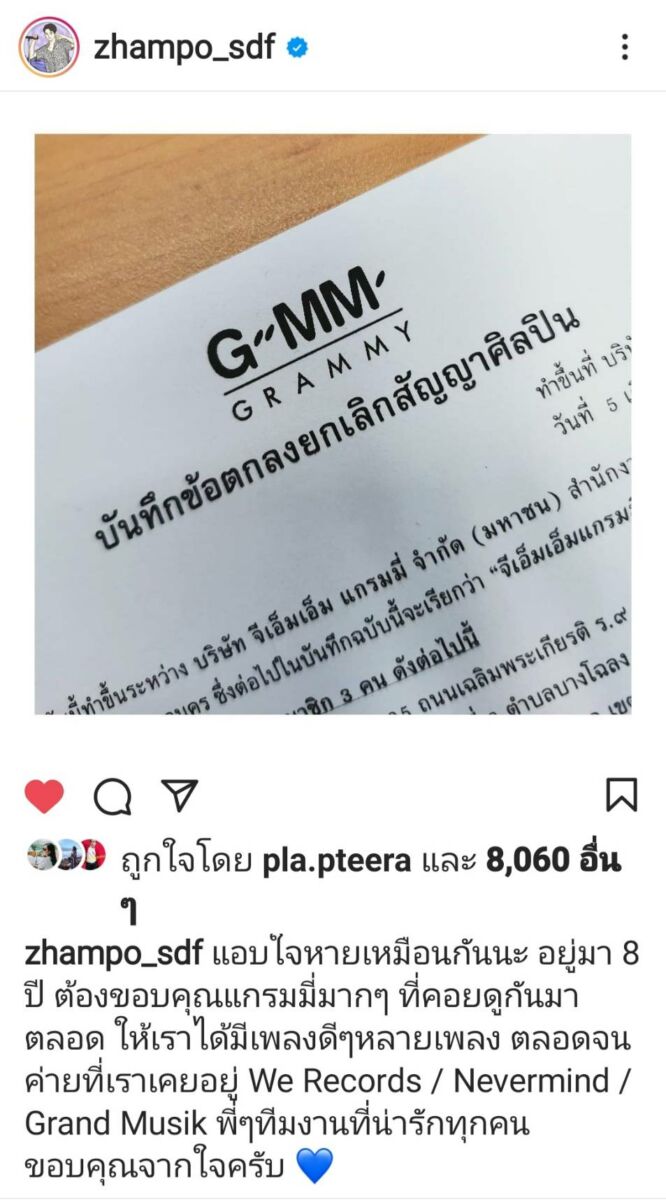 ก่อนหน้านี้มีคนตาดีแอบเห็น “แชมป์–นิตินันท์ จันทร์เดชา” นักร้องนำวง S.D.F โพสต์ใน IG บันทึกข้อตกลงยกเลิกสัญญาศิลปิน บริษัท จีเอ็มเอ็ม แกรมมี่ จำกัด (มหาชน) ในวันที่ 5 มีนาคม 2564 ที่ผ่านมา แฟนเพลงหลายคนต่างเข้