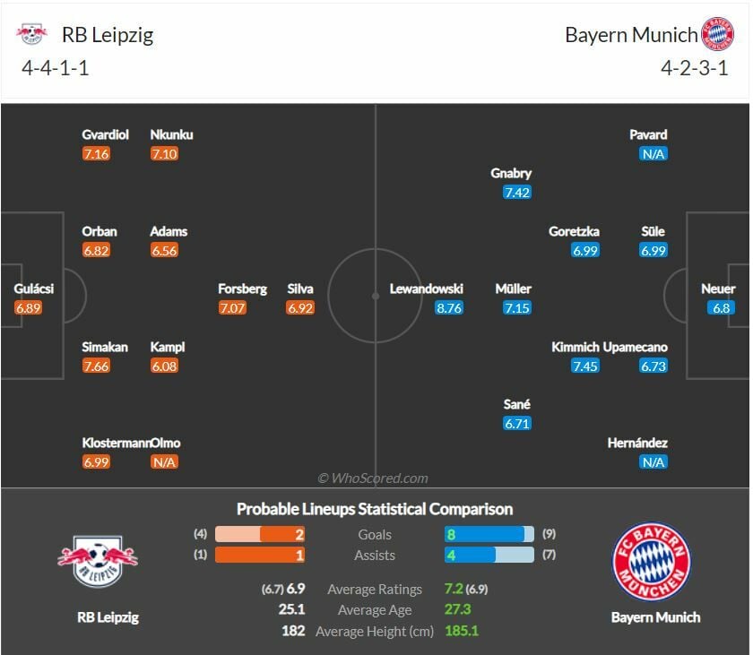 - การจัดทัพจะมาในระบบ 4-2-3-1 ได้ แบ็งฌาแม็ง ปาวาร์ กับ ลูก้าส์ แอร์กน็องเดซ หายเจ็บกลับมาประจำการกับ โรเบิร์ต เลวานดอฟสกี้, โธมัส มุลเลอร์, โยชัว คิมมิช, เลออน โกเร็ทซ์ก้า, แซร์จ นาบรี้ และ ลีรอย ซาเน่