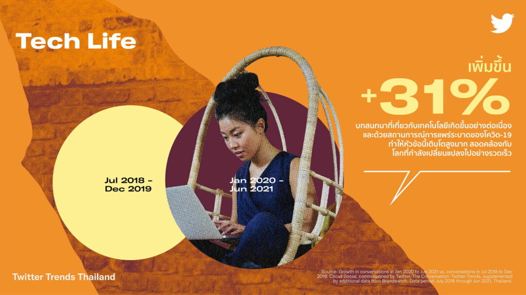 เป็นหัวข้อที่มีการพูดคุยสม่ำเสมอบนทวิตเตอร์ประเทศไทย โดยการแพร่ระบาดของโควิด-19 ผลักดันให้คนไทยก้าวไปข้างหน้าตามเทคโนโลยีที่เปลี่ยนแปลงไปอย่างรวดเร็ว ซึ่งสะท้อนได้จากบทสนทนาที่เกี่ยวกับชีวิตด้านเทคโนโลยีบนทวิตเตอร์ประเทศไทยที่เพิ่มขึ้น 31% ซึ่งสามารถแบ่งเป็นเทรนด์ได้ 3 เรื่อง คือ ชีวิตแบบดิจิทัลของฉัน ใช้ชีวิตอย่างชาญฉลาดด้วยเทคโนโลยี และการใช้เทคโนโลยีเพื่อสร้างสิ่งดีๆ
