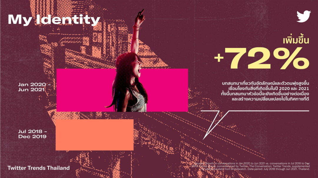 คนไทยมีความมั่นใจมากขึ้นและสามารถแสดงออกถึงความเป็นตัวเอง บทสนทนาที่เกี่ยวกับ My Identity หรืออัตลักษณ์ของตนเอง จึงเติบโตขึ้น 72% เชื่อมโยงสิ่งที่เกิดขึ้นในปี 2020 และ 2021 ซึ่งยังเกิดขึ้นอย่างต่อเนื่องและเปลี่ยนแปลงไปในทางที่ดี