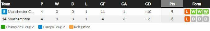- แมนฯ ซิตี้ ลงเล่นในเกมลีกพบกับ เซาธ์แฮมป์ตัน ในบ้านตัวเองและเอาชนะไปได้ใน 11 จาก 12 นัดหลังสุด