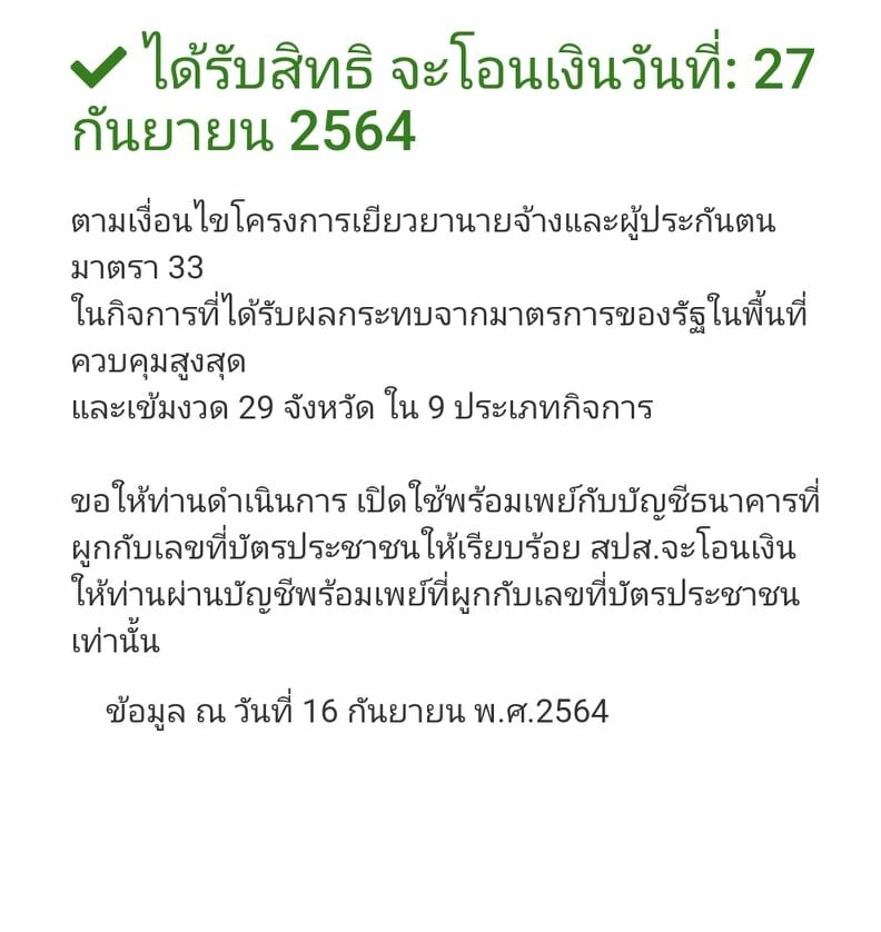 ทั้งนี้ ข่าวจากสำนักงานประกันสังคม แจ้งว่า เริ่มโอนเงินเยียวยารอบ 2 ให้ผู้ประกันตน ม.33 ใน 9 กลุ่มกิจการ ในพื้นที่ 13 จังหวัดสีแดงเข้ม ประกอบด้วย กรุงเทพมหานคร, นครปฐม, นนทบุรี, ปทุมธานี, สมุทรปราการ, สมุทรสาคร, ปัตตานี, ยะลา, นราธิวาส, สงขลา, ชลบุรี, ฉะเชิงเทรา และพระนครศรีอยุธยา วันที่ 21 และ 27 กันยายน 2564