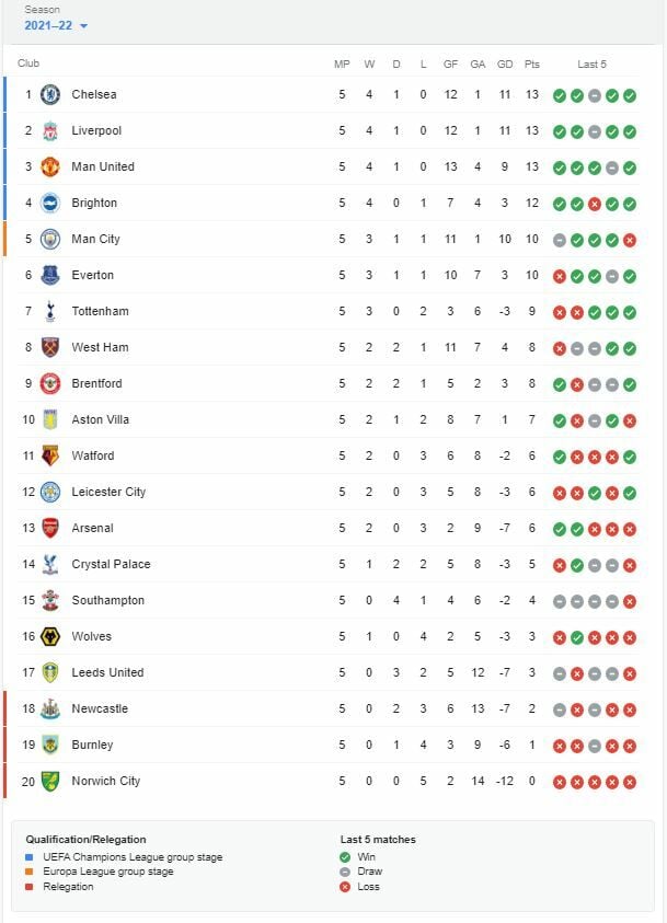 ทีมงาน The Thaiger ขอพาเพื่อนๆ ไป อัพเดท ตารางคะแนน พรีเมียร์ ลีก ล่าสุด หลังจบการแข่งขันในนัดที่ 5 เมื่อสุดสัปดาห์ที่ผ่านมา (20 กันยายน 2564)