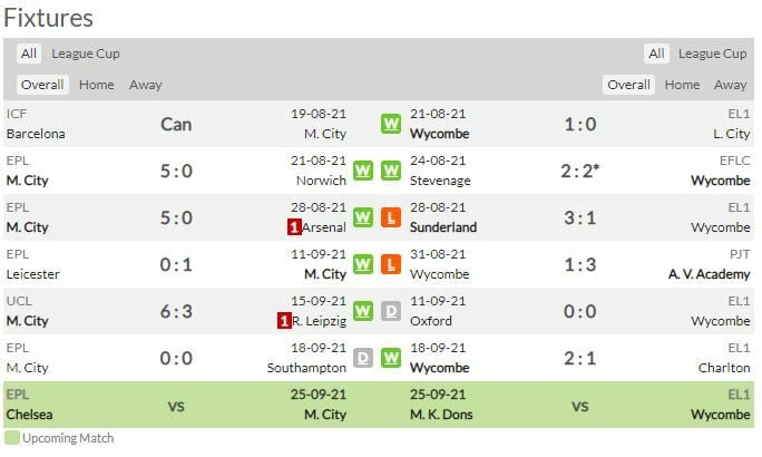 - 10/11/98 วีคอมบ์ วันเดอเรอร์ส 1-0 แมนเชสเตอร์ ซิตี้ (ลีก วัน)