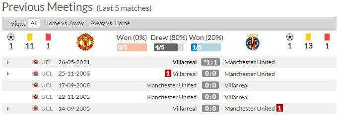- แมนฯ ยูไนเต็ด ลงเล่นพบกับ บียาร์เรอัล และเสมอกันมาใน 5 นัดหลังที่เจอกัน (ทุกรายการ)