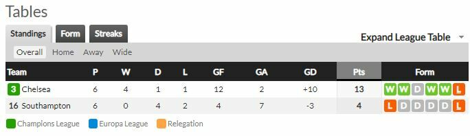 - เชลซี ลงเล่นพบกับ เซาธ์แฮมป์ตัน และไม่แพ้มาแล้วใน 11 จาก 12 นัดหลังที่เจอกัน (ทุกรายการ)
