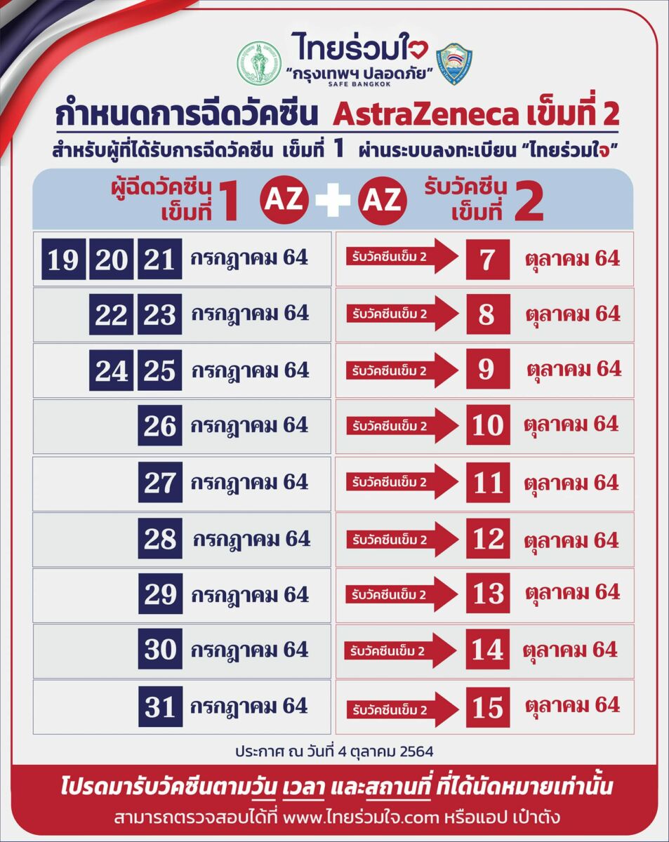 เพจเฟซบุ๊กของโครงการไทยร่วมใจได้ประชาสัมพันธ์แจ้งกำหนดการฉีดวัคซีนแอสตราเซเนกาเข็มที่สอง สำหรับผู้ที่ได้รับการฉีดวัคซีนแอสตราเซเนกา เข็มที่หนึ่ง ผ่านระบบลงทะเบียน “ไทยร่วมใจ”