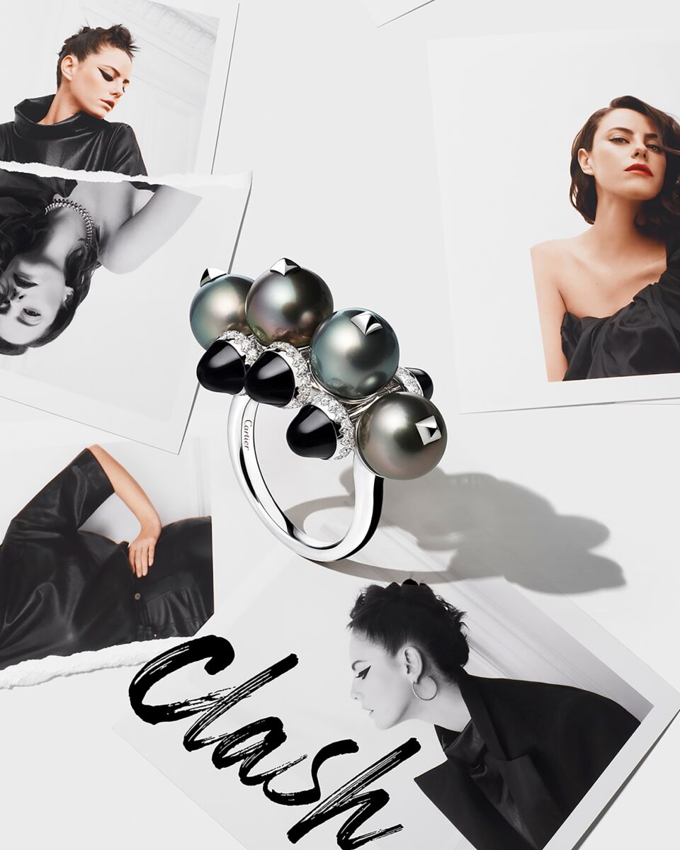 สมาชิกใหม่ที่เข้ามาเติมเต็มคอลเลคชั่นแคลช เดอ คาร์เทียร์ (Clash de Cartier) ในปีนี้ โดดเด่นด้วยไข่มุกดำจากหมู่เกาะตาฮีติ ไม่ว่าจะเป็นแหวน ต่างหูเม็ดเขื่องที่เรียงรายส่องประกายสีเทา เขียว และม่วง ผสานอย่างลงตัวกับตัวเรือนทองคำขาวและหมุดประดับออนิกซ์ที่ประกบอยู่ด้านข้าง หินออนิกซ์สีดำขลับเม็ดกลมที่ถูกจัดวางราวกับลอยตัวอยู่ด้านในชิ้นงาน เป็นสิ่งสำคัญที่กำหนดขนาดโครงสร้างด้านในของเครื่องประดับโรสโกลด์ในคอลเลคชั่น ทั้งแหวน, กำไลข้อมือ, จี้ห้อยคอและต่างหูแบบห่วง ทำให้ทุกชิ้นเล่นแสงระริกดูราวกับมีชีวิตยามสวมใส่ เครื่องประดับบางชิ้นสามารถสวมใส่ได้หลายแบบเพื่อสร้างมิติให้ทั้งสองขั้วเจตคติ เช่น ต่างหูแบบห่วงประดับหินออนิกซ์และต่างหูไข่มุกตาฮีติแบบข้างเดียวสามารถนำมาใส่ครอบติ่งหูได้เช่นเดียวกัน
