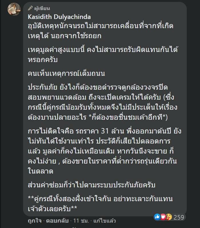 “อุบัติเหตุหนักจนรถไม่สามารถเคลื่อนที่จากที่เกิดเหตุได้ นอกจากใช้รถยก เหตุมูลค่าสูงแบบนี้คงไม่สามารถรับผิดแทนกันได้หรอกครับ คนเห็นเหตุการณ์เต็มถนน ประกันภัยยังไงก็ต้องขอตำรวจดูกล้องวงจรปิด สอบพยานแวดล้อม ถึงจะเปิดเคลมให้ได้ครับ (ซึ่งกรณีนี้คู่กรณีน้อมรับทั้งหมดจึงไม่มีประเด็นให้เรื่องต้องบานปลายอะไร ก็ต้องขอชื่นชมเค้าอีกที)