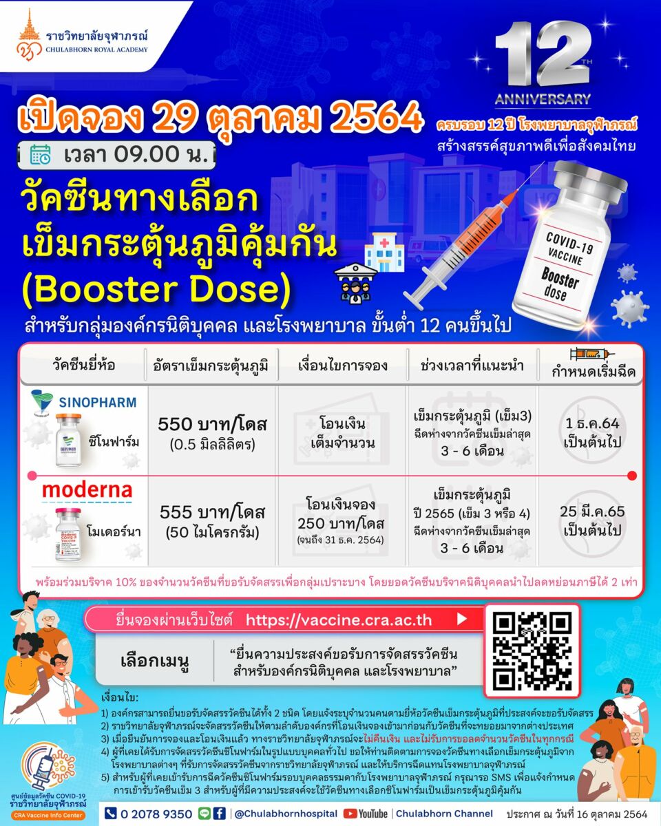 ศูนย์ข้อมูลราชวิทยาลัยจุฬาภรณ์ ได้โพสต์ข้อความลงเฟซบุ๊ก ประกาศเปิดจองวัคซีนทางเลือกยี่ห้อโมเดอร์นา เพื่อฉีดเป็นวัคซีนกระตุ้นหรือ Booster Dose ในวันที่ 29 ตุลาคมนี้ เวลา 9.00 น. สำหรับองค์กรนิติบุคคล และโรงพยาบาลที่ให้บริการฉีดวัคซีนซิโนฟาร์ม ขั้นต่ำ 12 คนขึ้นไป ในโอกาสครบรอบ 12 ปี โรงพยาบาลจุฬาภรณ์ สร้างสรรค์สุขภาพดีเพื่อสังคมไทย