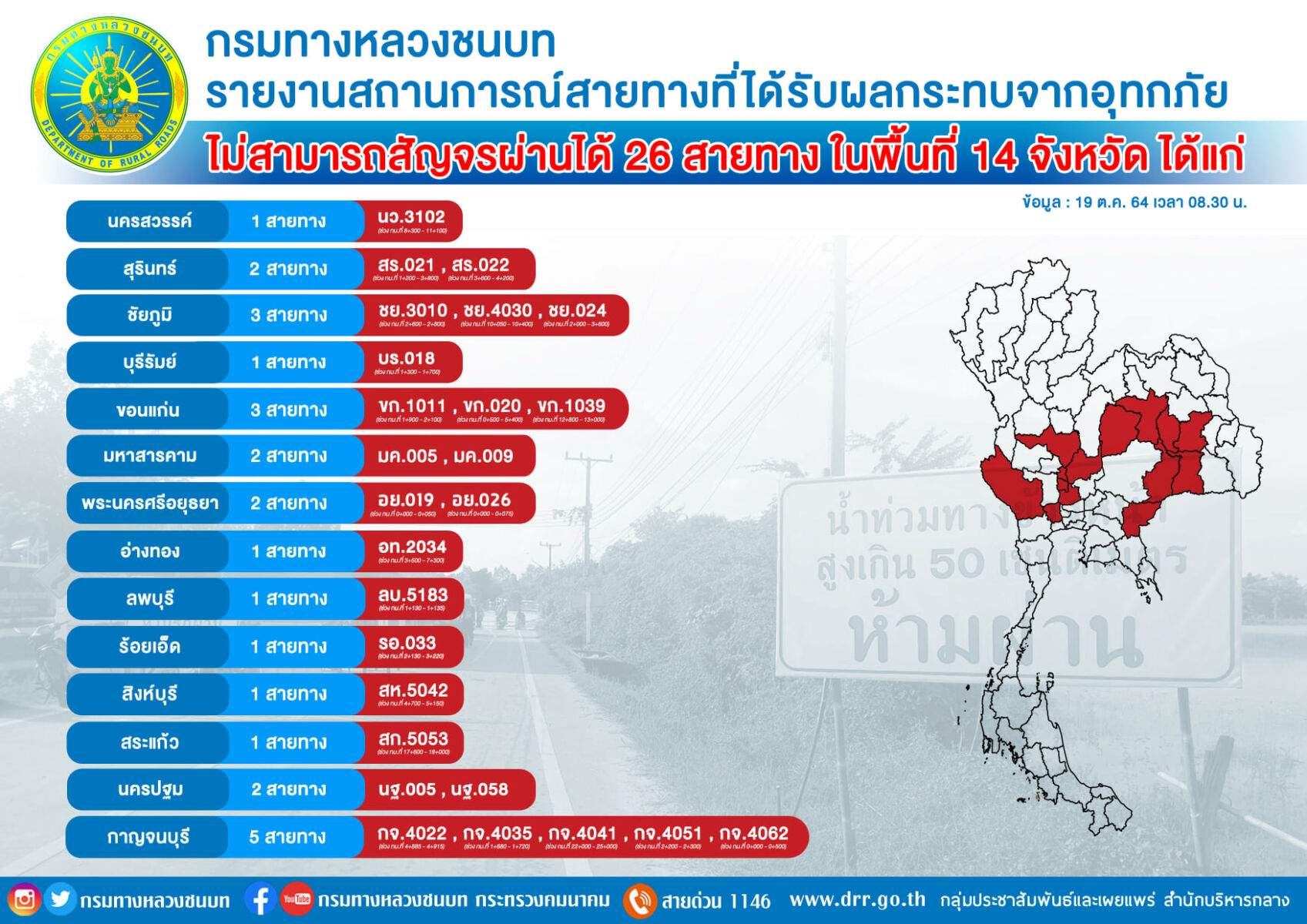 ทางหลวงชนบท เผยว่าในขณะนี้ได้ทำการ ปิดทางหลวง 26 แห่ง หลังจากที่เกิดน้ำท่วมหนัก จนไม่สามารถให้ประชาชนสามารถสัญจรผ่านได้