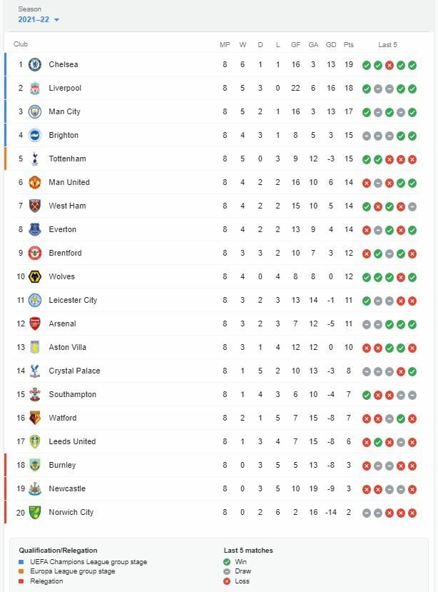 ทีมงาน The Thaiger ขอพาเพื่อนๆ ไป อัพเดท ตารางคะแนนพรีเมียร์ลีก ล่าสุด หลังจบการแข่งขันในนัดที่ 8 เมื่อสุดสัปดาห์ที่ผ่านมา (19 ตุลาคม 2564)