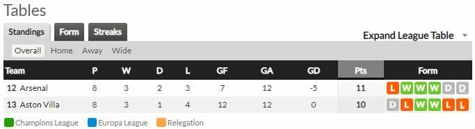 - แอสตัน วิลล่า ลงเล่นพบกับอาร์เซน่อลและเอาชนะรวมทั้งเก็บคลีนชีตได้ใน 3 นัดหลังสุดที่เจอกัน (ทุกรายการ)