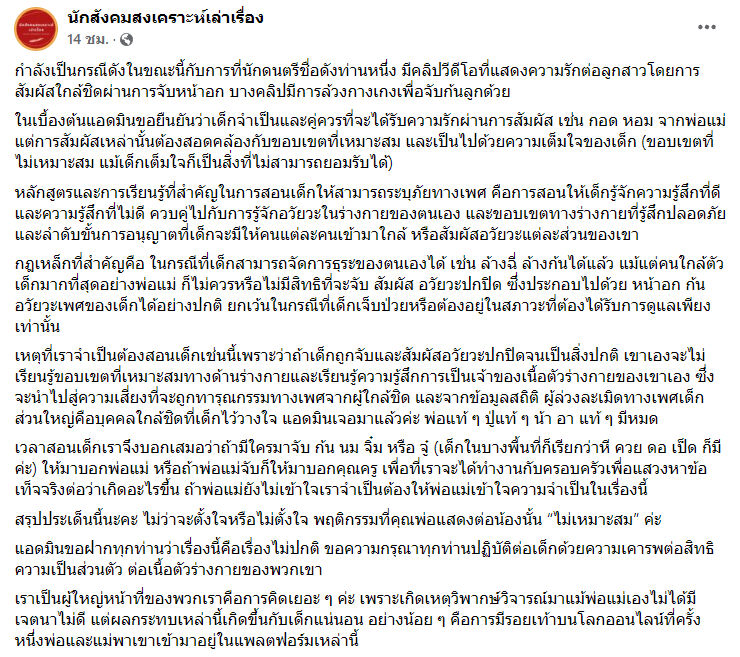 “กำลังเป็นกรณีดังในขณะนี้กับการที่นักดนตรีชื่อดังท่านหนึ่ง มีคลิปวีดีโอที่แสดงความรักต่อลูกสาวโดยการสัมผัสใกล้ชิดผ่านการจับหน้าอก บางคลิปมีการล้วงกางเกงเพื่อจับก้นลูกด้วย ในเบื้องต้นแอดมินขอยืนยันว่าเด็กจำเป็นและคู่ควรที่จะได้รับความรักผ่านการสัมผัส เช่น กอด หอม จากพ่อแม่ แต่การสัมผัสเหล่านั้นต้องสอดคล้องกับขอบเขตที่เหมาะสม และเป็นไปด้วยความเต็มใจของเด็ก (ขอบเขตที่ไม่เหมาะสม แม้เด็กเต็มใจก็เป็นสิ่งที่ไม่สามารถยอมรับได้)