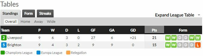 - ก่อนแข่งเกมนี้ ไบรท์ตันรั้งอันดับ 5 ของตาราง แข่งไป 9 นัด มีอยู่ 15 แต้ม