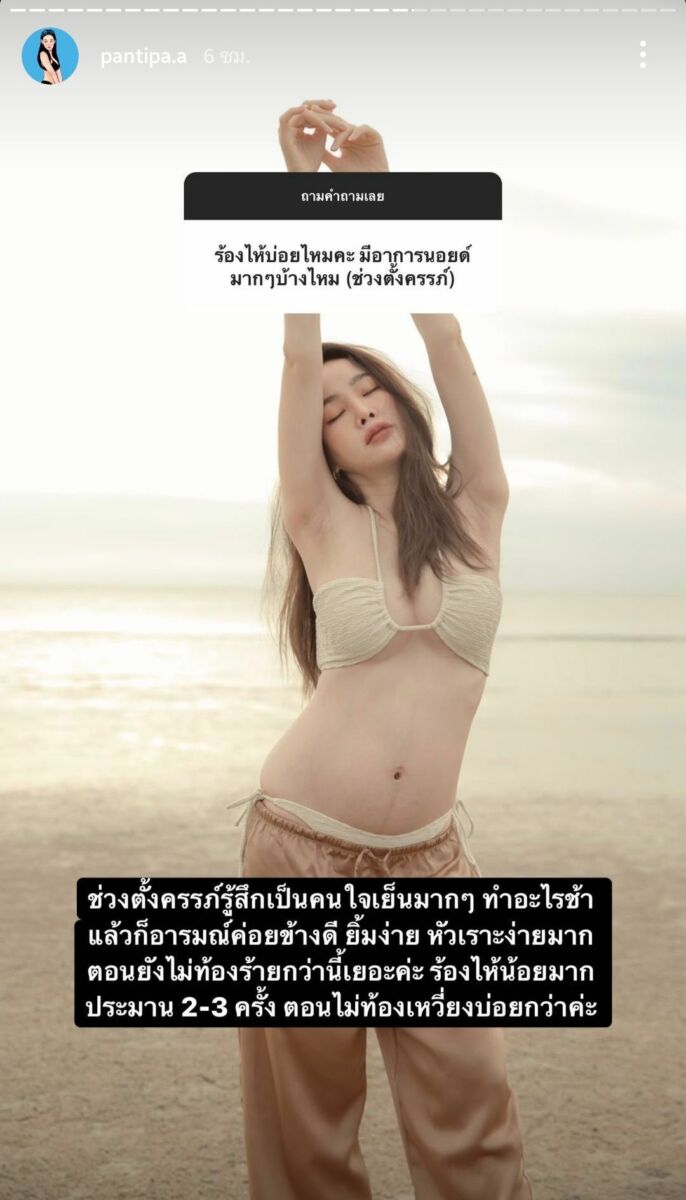 “ช่วงตั้งครรภ์รู้สึกเป็นคนใจเย็นมาก ๆ ทำอะไรช้า แล้วก็อารมร์ค่อนข้างดี ยิ้มง่าย หัวเราะง่ายมาก ตอนยังไม่ท้องร้ายกว่านี้เยอะค่ะ ร้องไห้น้อยมาก ประมาณ 2-3 ครั้ง ตอนไม่ท้องเหวี่ยงบ่อยกว่าค่ะ”
