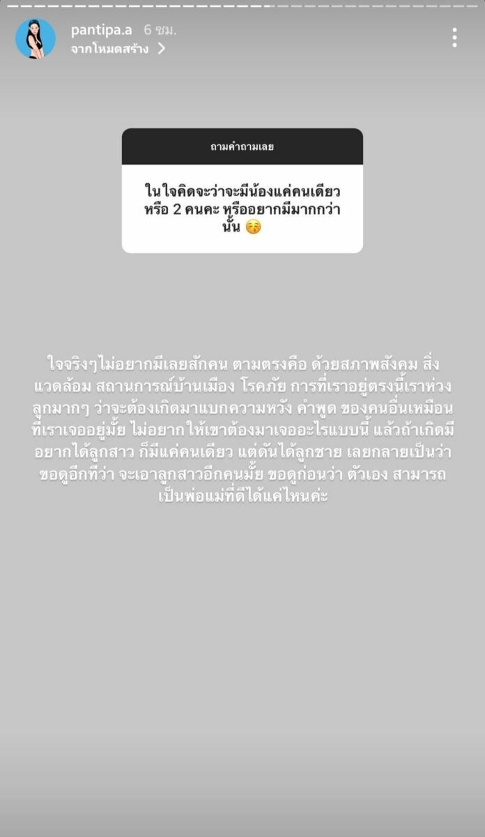 “ใจจริง ๆ ไม่อยากมีเลยสักคน ตามตรงคือ ด้วยสภาพสังคม สิ่งแวดล้อม สถานการณ์บ้านเมือง โรคภัย การที่เราอยู่ตรงนี้เราห่วงลูกมาก ๆ ว่าจะต้องเกิดมาแบกความหวัง คำพูด ของคนอื่นเหมือนที่เราเจออยู่ไหม ไม่อยากให้เขาต้องมาเจออะไรแบบนี้ แล้วถ้าเกิดมีอยากได้ลูกสาว ก็มีแค่คนเดียว แต่ดันได้ลูกชาย เลยกลายเป็นว่าขอดูอีกทีว่าจะเอาลูกสาวอีกคนไหม ขอดูก่อนว่าตัวเองสามารถเป็นพ่อแม่ที่ดีได้แค่ไหนค่ะ”