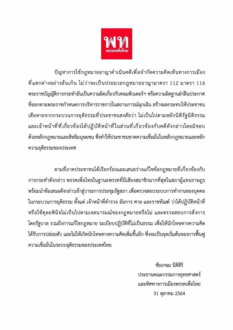เพื่อไทย ร่อนจดหมายสนับสนุนข้อเรียกร้องของกลุ่มราษฎร แก้ไข ม.112-116. ชี้ไม่มิชอบด้วยกฎหมายและสิทธิมนุษยชน