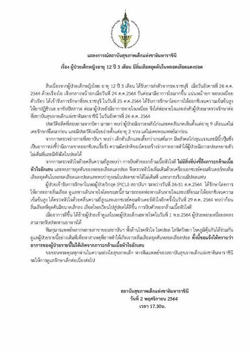 ขอขอบพระคุณทุกท่านในความห่วงใยสุขภาพเด็ก ทางทีมแพทย์ของสถาบันสุขภาพเด็กแห่งชาติมหาราชินีจะให้การดูแลรักษาเด็กต่อเนื่องต่อไป”