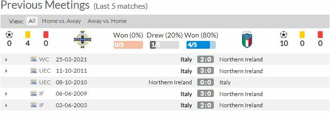 - ไอร์แลนด์เหนือ ลงเล่นพบกับ อิตาลี 5 นัดหลังสุด และเอาชนะไม่ได้เลย (ทุกรายการ)