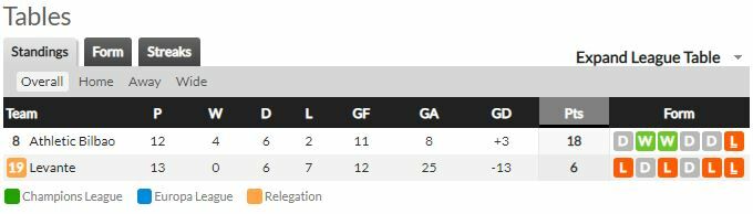 - เลบันเต้ ลงเล่นพบกับ แอธ.บิลเบา และเสมอกันใน 3 นัดหลังสุด (ทุกรายการ)