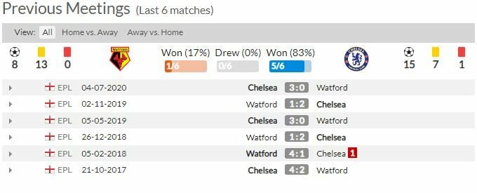 - วัตฟอร์ด โดนเชลซียิงประตูอย่างน้อยเกมละ 2 ลูก ใน 7 จาก 8 นัดหลังที่พบกัน (ทุกรายการ)