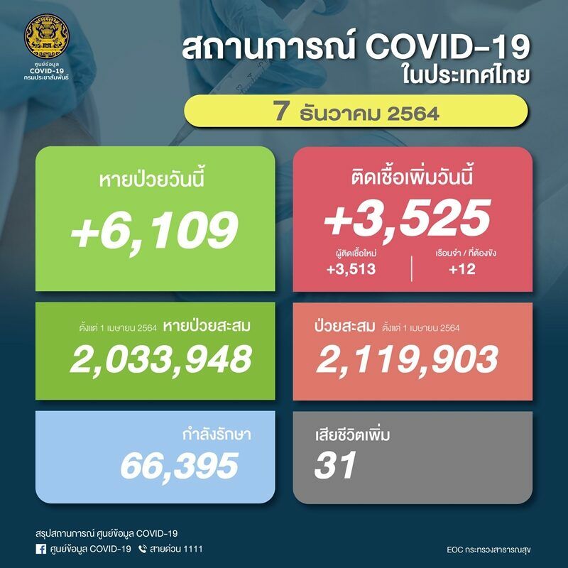 โควิดไทยวันนี้ 7 ธ.ค. ติดเชื้อเพิ่ม 3,525 ราย ดับ 31 ศพ