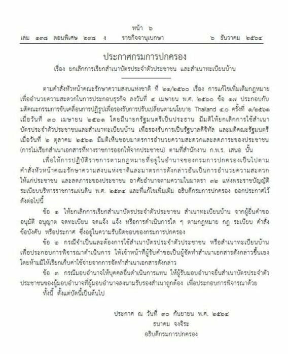 ราชกิจจาฯ เผยแพร่ประกาศ ยกเลิกสำเนาทะเบียนบ้าน-บัตร ปชช.