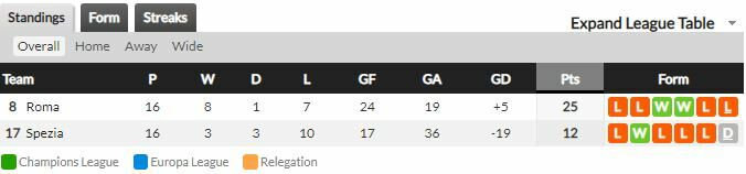 - สเปเซีย ลงเล่นเป็นทีมเยือนและไม่ชนะมาแล้ว 5 นัดติดต่อกัน (เกมลีก)