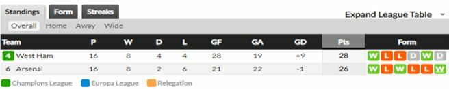 - อาร์เซน่อล อยู่ในอันดับที่ 6 แข่ง 16 นัด มี 26 คะแนน