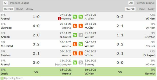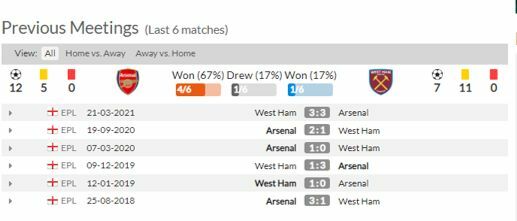 - เจอกัน 6 เกมล่าสุดในพรีเมียร์ ลีก อาร์เซน่อล ชนะ 4 เสมอ 1 เวสต์แฮม ชนะ 1