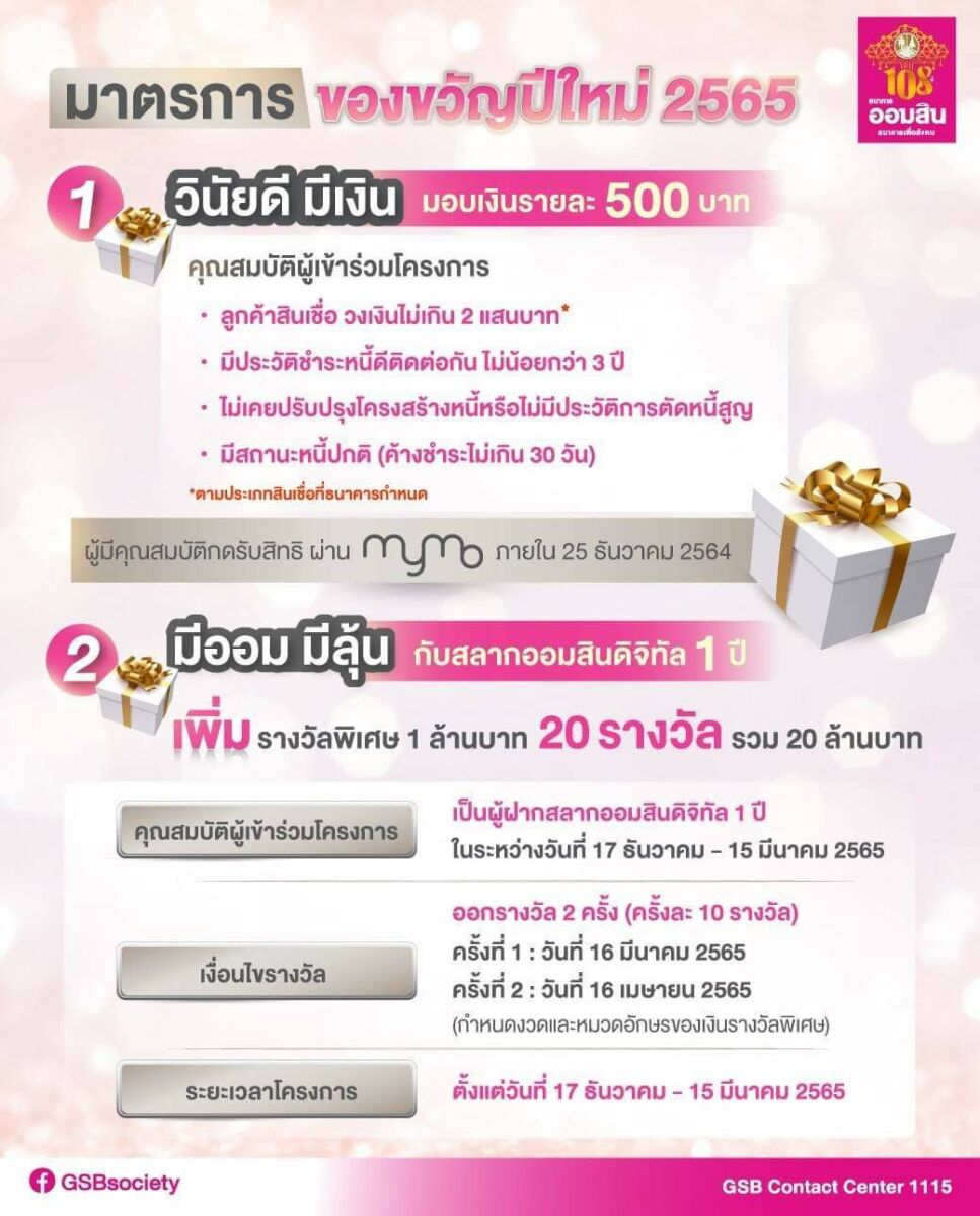 นายวิทัย รัตนากร ผู้อำนวยการธนาคารออมสิน เปิดเผยว่า ตามที่ พลเอกประยุทธ์ จันทร์โอชา นายกรัฐมนตรี ได้มอบหมายให้ทุกกระทรวงจัดของขวัญปีใหม่ 2565 ให้กับลูกค้า โดย ธนาคารออมสิน ภายใต้สังกัดกระทรวงการคลัง ได้จัดทำมาตรการ “ของขวัญปีใหม่ 2565” มอบให้ทั้งลูกค้าเงินกู้และลูกค้าเงินฝาก ในส่วนของลูกค้าเงินกู้ มอบของขวัญผ่านโครงการ “วินัยดีมีเงิน” สำหรับลูกค้าสินเชื่อเดิมที่มีวงเงินกู้ไม่เกิน 2 แสนบาท มีประวัติการชำระหนี้ดีติดต่อกันไม่น้อยกว่า 3 ปี มีสถานะหนี้ปกติ(ค้างชำระไม่เกิน 30 วัน) ไม่เคยปรับปรุงโครงสร้างหนี้หรือประวัติการตัดหนี้สูญ จะได้รับเงินคืนเข้าบัญชีเป็นเงิน 500 บาท โดยธนาคารจะแจ้งสิทธิให้ลูกค้าที่มีคุณสมบัติดังกล่าวทราบทาง MyMo และขอให้กดรับสิทธิภายในวันที่ 25 ธันวาคม 2564 โดยธนาคารจะโอนเงินเข้าบัญชีภายในวันที่ 31 ธันวาคม 2564