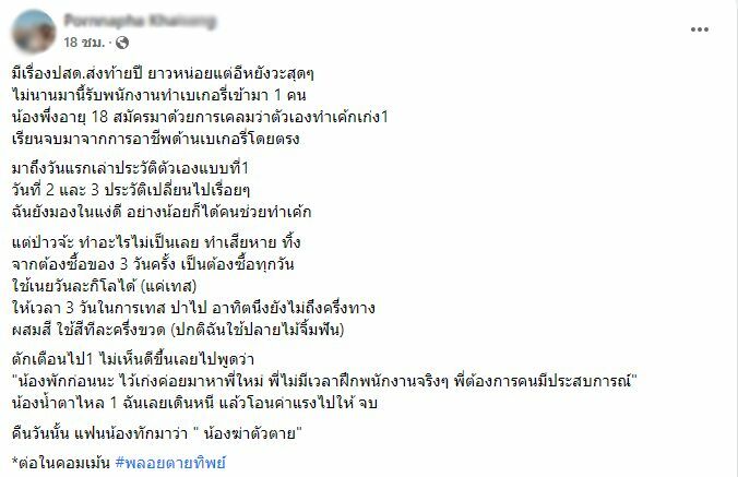 เจ้าของร้านเบเกอรี่ได้ออกมาเล่าเหตุการณ์สุดประหลาดส่งท้ายปี หลัง #พลอยตายทิพย์ ปั้นเรื่อง ฆ่าตัวตายหลังไม่ผ่านทดลองงาน