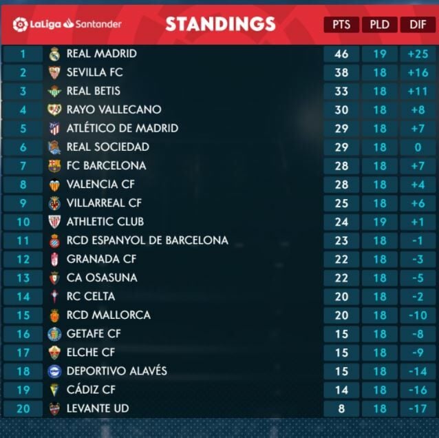 - เรอัล มาดริด แข่ง 19 นัด ผลต่าง +25 มี 46 คะแนน