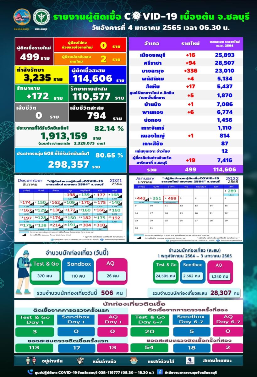 โควิดชลบุรี 4 ม.ค. 65 เครียดหนักต่อเนื่อง พบผู้ป่วยใหม่ 499 ราย