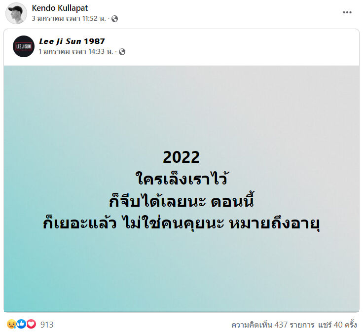 “2022 ใครเล็งเราไว้ ก็จีบได้เลยนะ ตอนนี้ ก็เยอะแล้ว ไม่ใช่คนคุยนะ หมายถึงอายุ”