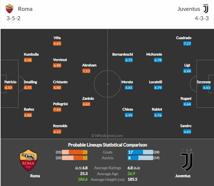 โรม่า แม้จะได้เปรียบจากการเล่นในบ้านในเกมนี้ และต้องการสามแต้มเพื่อทำคะแนนทาบยูเวนตุสให้ได้ แต่เกมนี้คุณภาพทีมเยือนยังดูเหนือกว่านิดๆ แต่เจ้าบ้านขาดผู้เล่นไปหลายรายจากโทษแบน และมีสิทธิ์สูงที่จะแพ้คาบ้านในเกมนี้