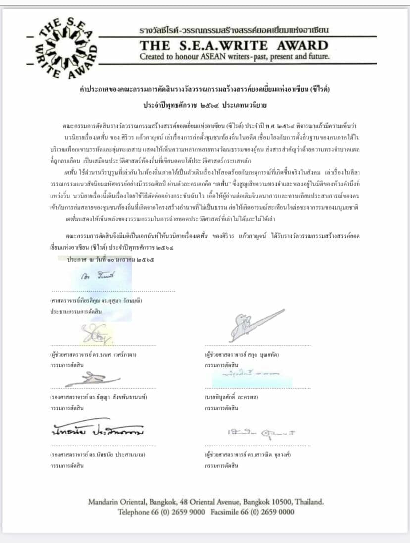 คำประกาศของคณะกรรมการตัดสินรางวัลวรรณกรรมสร้างสรรค์ยอดเยี่ยมแห่งอาเซียน (ซีไรต์) ประจำปีพุทธศักราช 2564 ประเภทนวนิยาย