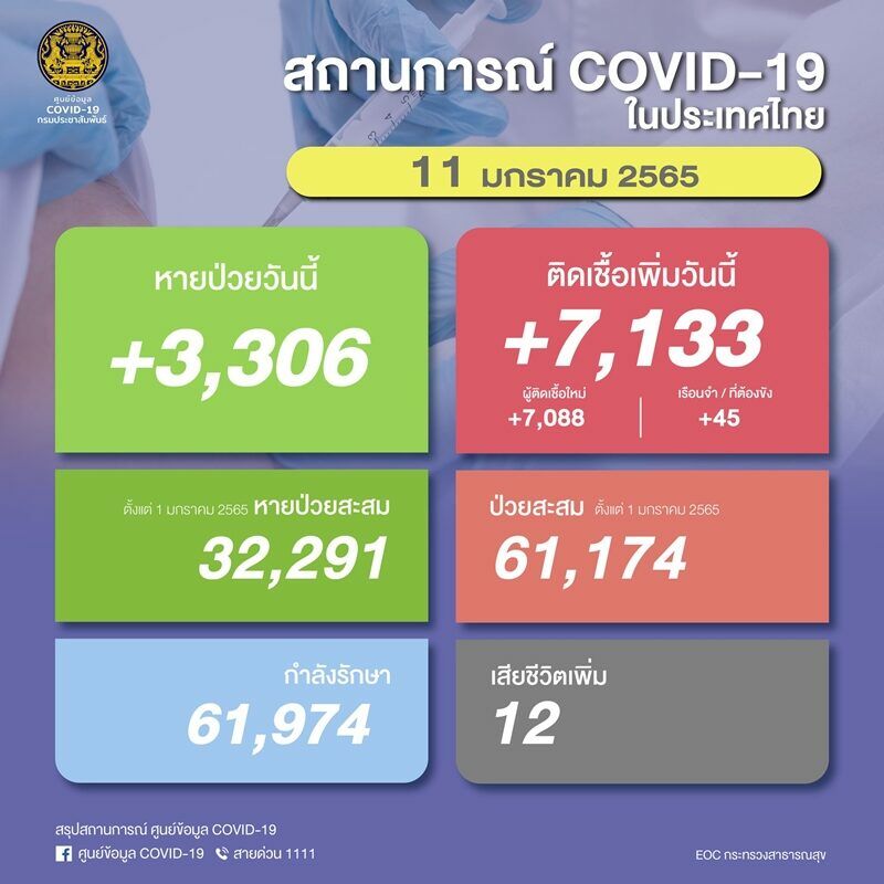 โควิดวันนี้ล่าสุดไทย 11 มกราคม 2565 ติดเชื้อเพิ่ม 7,133 ราย อัปเดตสถานการณ์แพร่ระบาดของโรคโควิด-19 ล่าสุด เสียชีวิตเพิ่ม 12 ราย หายป่วย 3,306 ราย
